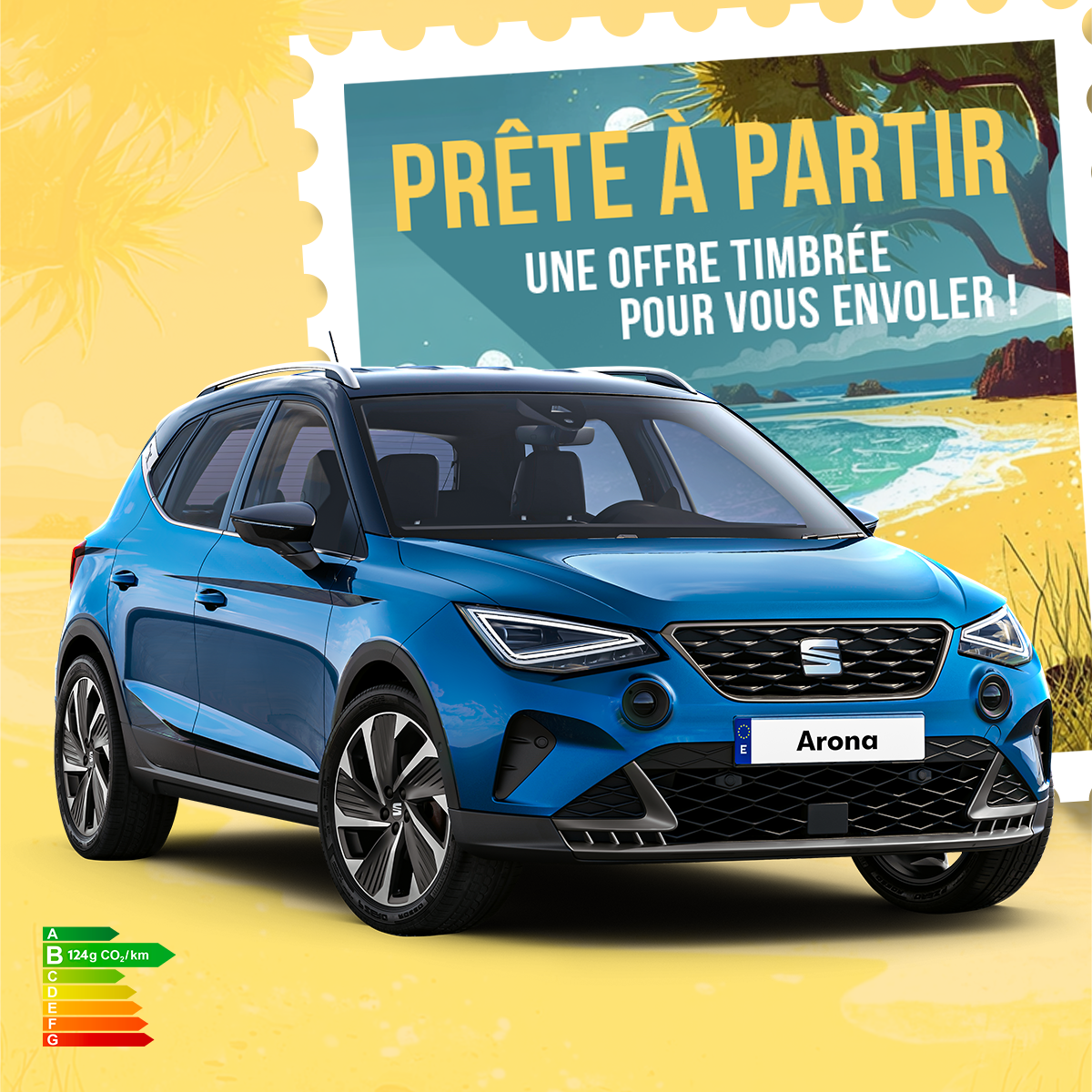 Exemple d’avantage client de 7 000 € sur tous les SEAT ARONA 1L ESSENCE 95CH REFERENCE. Tarif de 25 168,76 € au lieu de 32 168,76 €, malus, carte grise, peinture métallisée, forfait de livraison compris et hors options et prestations facultatives. Exemple pour la location longue durée d’une SEAT ARONA 1L ESSENCE 95CH REFERENCE, peinture métallisée comprise, hors accessoires, sur une durée de 60 mois et 60 000 km soit 59 loyers de 320 € TTC après un 1er loyer majoré de 2 100 € TTC. Consommation mixte (l/100km) : 6,0. Emission de CO2 (g/km) : 124. Prix du kilomètre supplémentaire de 0,15 € en sus, sous réserve du tarif constructeur en vigueur. Montants exprimés en TTC peinture métallisée, carte grise, forfait de livraison, malus compris et hors options et prestations facultatives. Offre non cumulable, réservée aux particuliers dans le réseau COMPAGNIE AUTOMOBILE DE TRANSPORT n° RCS St-Denis 423 510 593 participant, valable du 12/02/2026 au 31/03/2026, pour toute location longue durée d’une SEAT ARONA 1L ESSENCE 95CH REFERENCE hors accessoires. Voir conditions en concessions. Sauf erreur de typographie ou d’impression. Visuels non contractuels : les véhicules peuvent comporter des accessoires ou options non disponibles. Dans la limite des stocks disponibles.